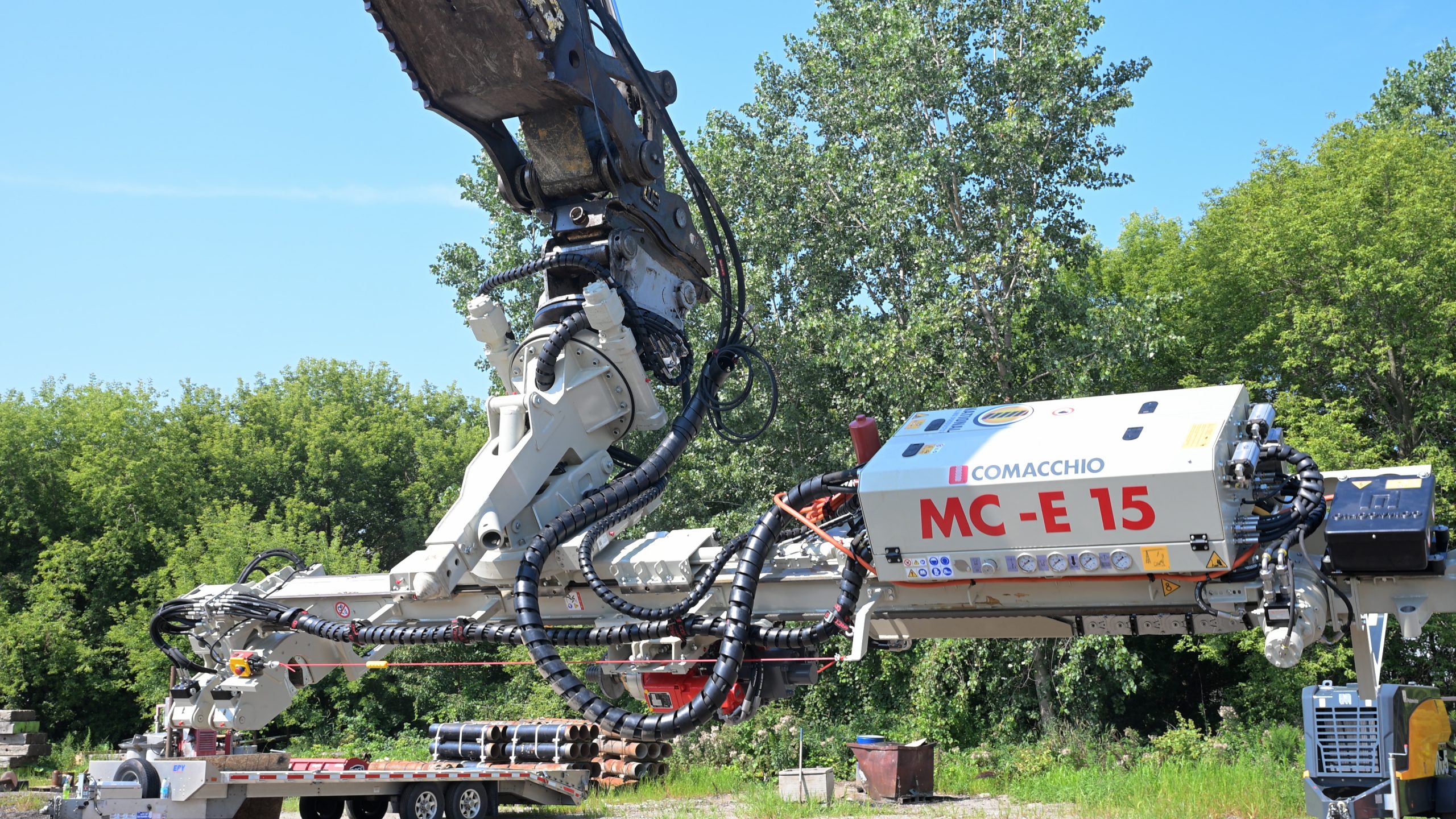 The Comacchio MC E 15 is a compact, powerful drilling attachment primarily designed for civil engineering applications such as micropiles, anchors, jet grouting, and ground consolidation, especially where access is limited or confined. Its standout strengths are its versatility in movement and inclination—enabled by installation on the boom of a 15-ton excavator and advanced articulation—which lets it operate on sites like road edges, slopes, docks, and other challenging environments.